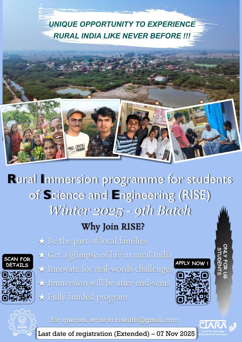 Please note that only undergraduates students of year 1, 2, and 3 (DDP - year 1, 2, 3, 4) can apply for this program. Step Into the Real India โ€“ Join RISE! Are you ready to swap classrooms for solving real-world problems? RISE (Rural Immersion Program) at IIT-Bombay takes you beyond textbooks and into Indiaโ€™s villages. Join RISE? ๐ŸŒพ Live the Rural Experience โ€“ Stay with local families ๐Ÿ”Ž Discover Rural Realities โ€“ See the obstacles and resilience that shape life ๐Ÿ›  Innovate & Solve โ€“ Apply your technical knowledge for rural development. The best part? Itโ€™s fully funded! Since 2019, 75+ students have transformed their perspectives through RISE. Now itโ€™s your turn! Apply now -https://forms.gle/4bPrZqJt9h3KNruSA Form : - https://docs.google.com/forms/d/e/1FAIpQLSeXXVe-aQszQJCAKfSnsi1_Ey8xF89Rq9MqiV-phkmg3h1d2g/viewform Website : - https://www.ctara.iitb.ac.in/en/RISE Applications for RISE are now open until 7th November 2025 Midnight. Join the WhatsApp group for further communication: https://chat.whatsapp.com/BmY1wfU7hOnLeayVZFpMtK