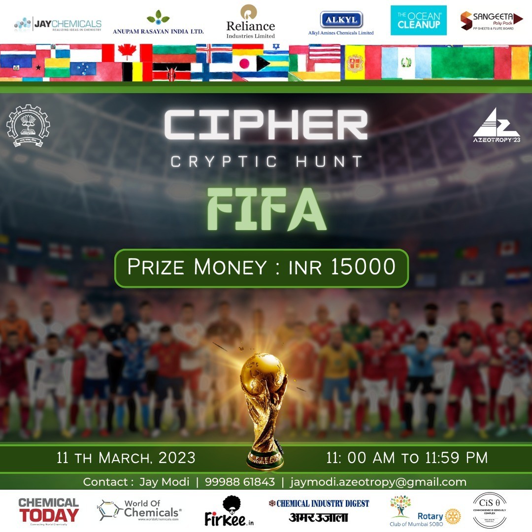 Cipher is a theme-based cryptic hunt organized by AZeotropy, IIT Bombay. This year's theme is the FIFA World Cup, and we have some exciting clues for you.