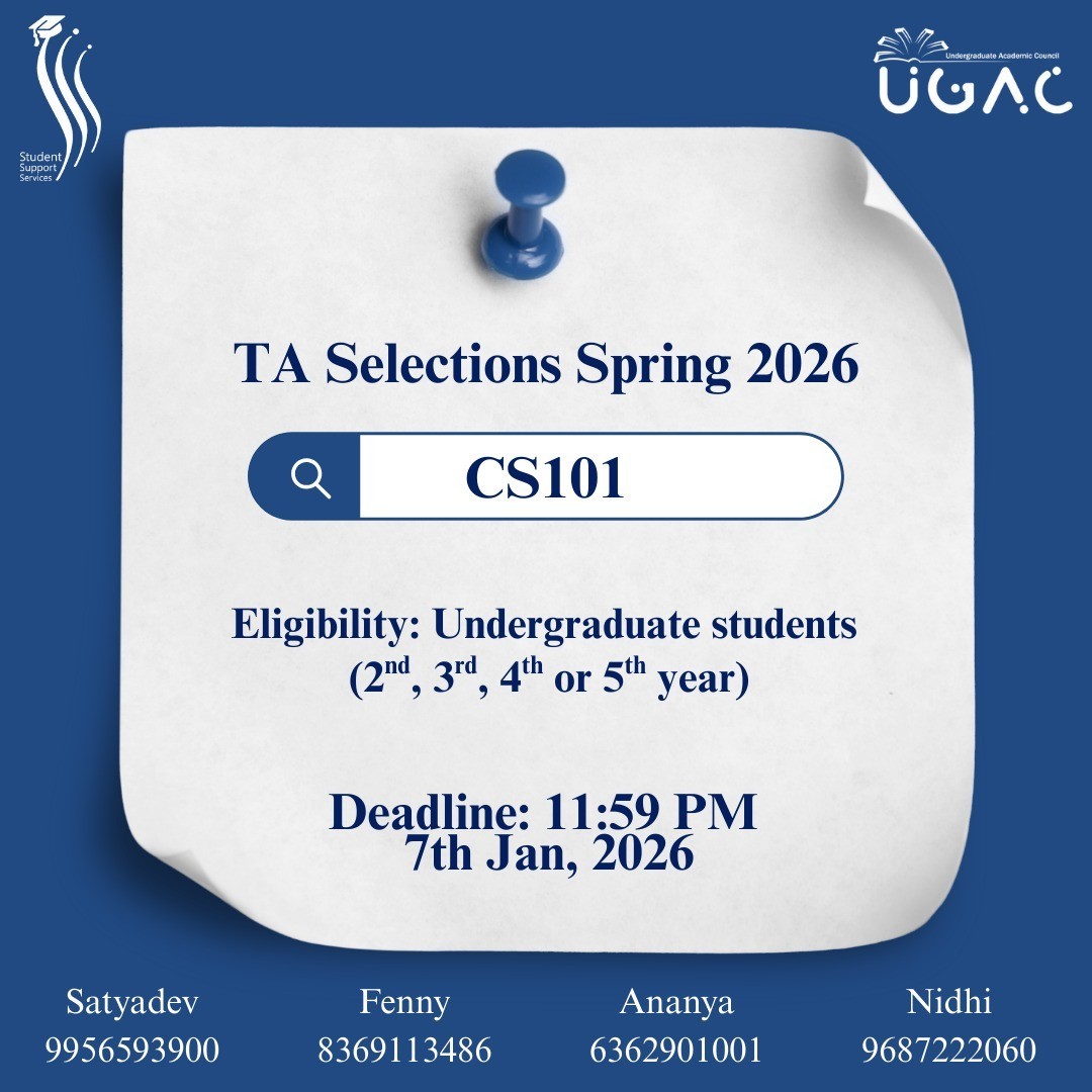IMPORTANT AND TO BE NOTED: It has been observed that students (especially UGs) often do not commit the required time and effort as a teaching assistant, which leads to a certain bias against them. It is highly recommended to fill the TA-ship of a particular course only if you are interested in pursuing it sincerely and can dedicate proper time to the task.