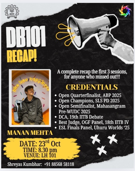 If you missed the first few sessions but still want to start debating before our fourth one, this is the perfect opportunity. The session will be taken by none other than Manan Mehta, who will revisit all the key fundamentals, from constructing strong arguments and understanding motions to refining the basic BP structure.