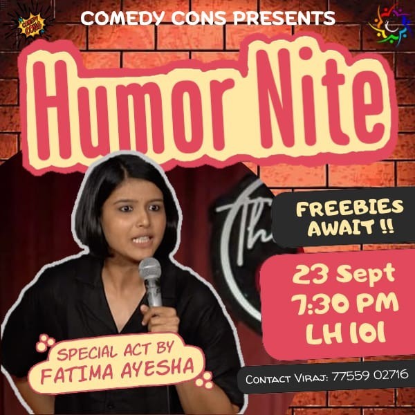 We are back with the Humor Nite and we cordially invite you all to have an evening full of laughter with us . The event includes a lineup of standup comedy acts followed by a special act by Fatima Ayesha Khan, a civil engineer by degree but so good at constructing jokes that you will feel her punches right through you .
