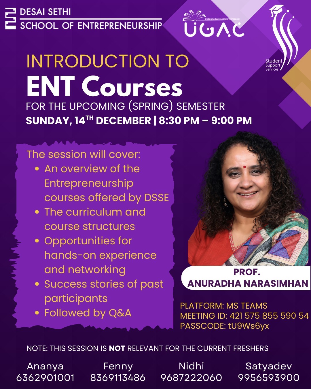 We are excited to invite you to a brief session with Professor Anuradha Narasimhan, who will guide you through the Entrepreneurship courses available during pre-registration for the Spring semester. This session is designed to help you understand course prerequisites, registration procedures, and opportunities these courses offer.