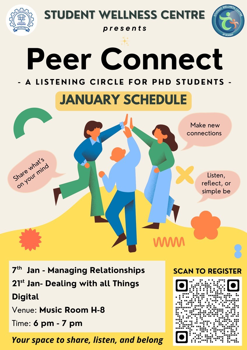 Peer Connect is an SWC initiative designed for PhD students. It offers a safe, welcoming, and non-judgmental space where you can simply show up — to talk, listen, or just be. These informal group sessions, facilitated by SWC’s student counsellors, are a chance to share what’s on your mind, hear others’ experiences, and feel a sense of connection. There’s no pressure to fix or solve anything. It’s simply a space for empathy, understanding, and real conversations.