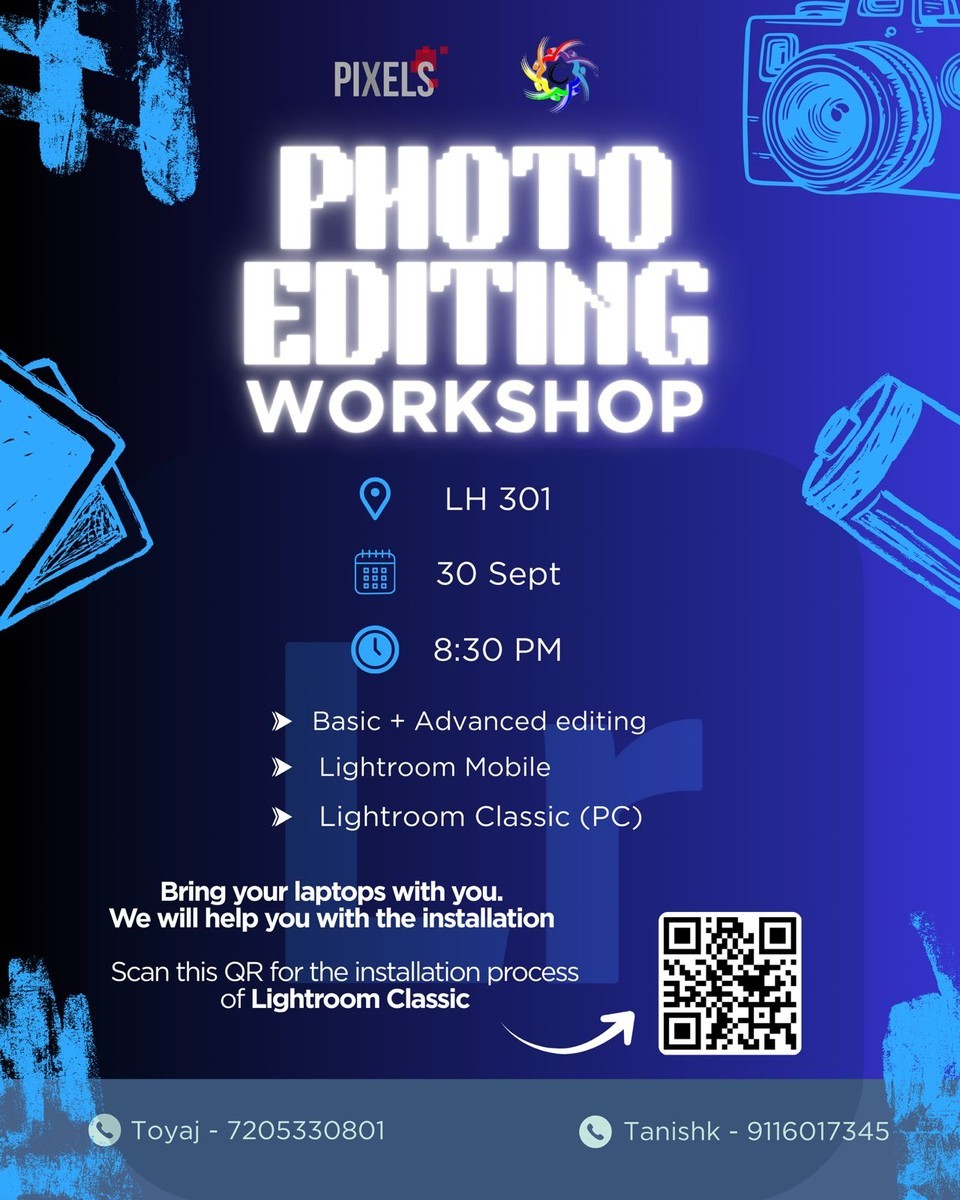 Rang and Pixels, the Photography and Fine Arts Club of IIT Bombay, is excited to invite you to a Photo Editing Workshop where we’ll take you from the basics to advanced techniques using Adobe Lightroom.