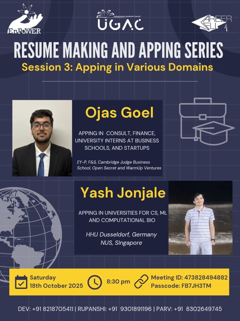 EnPoWER and Career Cell are excited to announce the third session of the Resume Making & Apping Series. In this session on “Apping”, we will cover the dynamics of apping and the various steps that set the foundation for the entire process, with insights from seasoned seniors who have been in your shoes and are here to guide you and share their experiences.