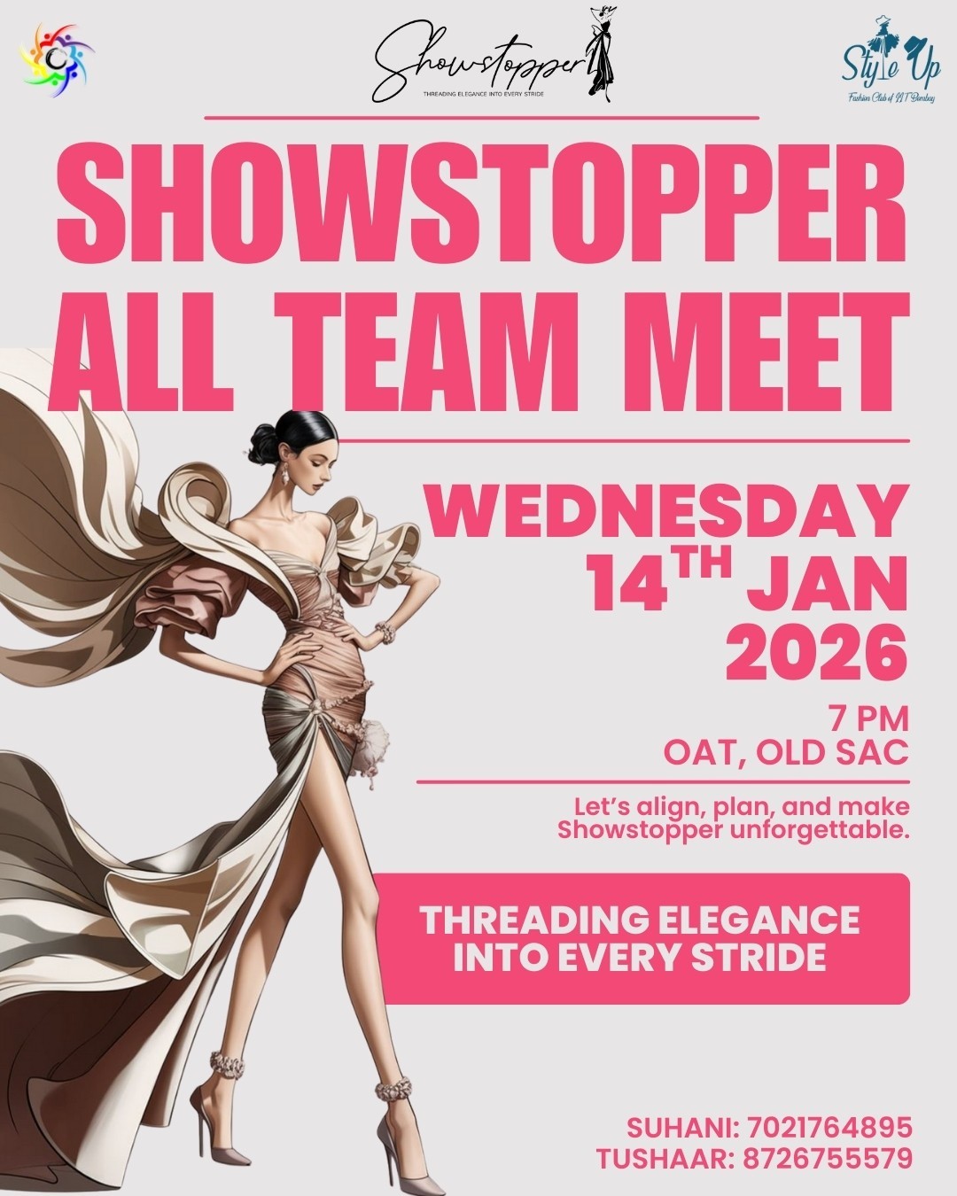 This meet is for designers, organizers, models, choreographers, and mentors to come together, get introduced to their respective teams, and connect with the seniors of the club who will be closely involved throughout the journey. It’s a chance to put faces to names, understand how different teams fit together, and ease into the flow of the event in a comfortable, friendly setting.