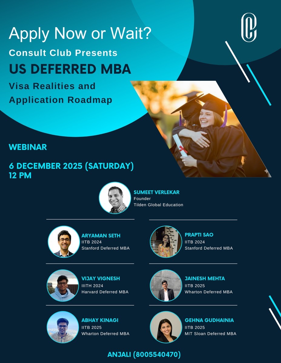 Are you curious about Deferred MBA programs in the US and how to build a strong application during your undergrad? Join us for an exclusive online information session with Sumeet Verlekar from Tilden Global Education and IIT Bombay Alumni admits to Harvard-Stanford-Wharton, where they will break down the process, timeline, and strategies to maximise your chances with students who have gained acceptances to the world's top colleges through this process..
