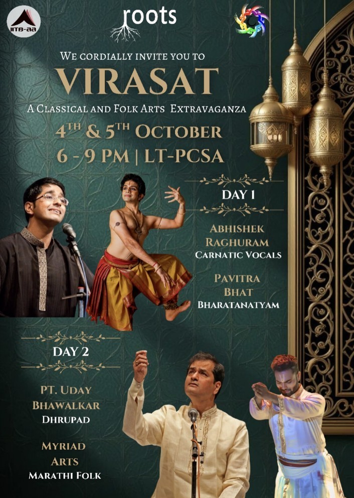 We are thrilled to invite you to Virasat – A Classical and Folk Art Extravaganza, presented by Roots Club and IITB Alumni Association. Virasat is our annual celebration of India's rich and timeless cultural heritage, bringing together some of the most eminent artists to carry forward the legacy.